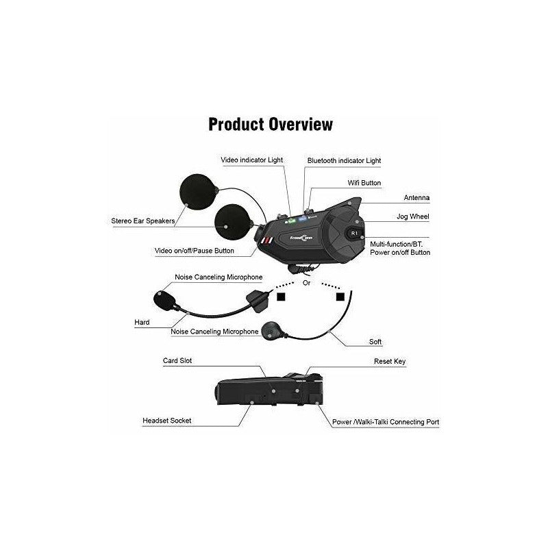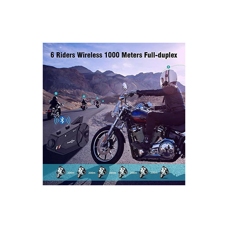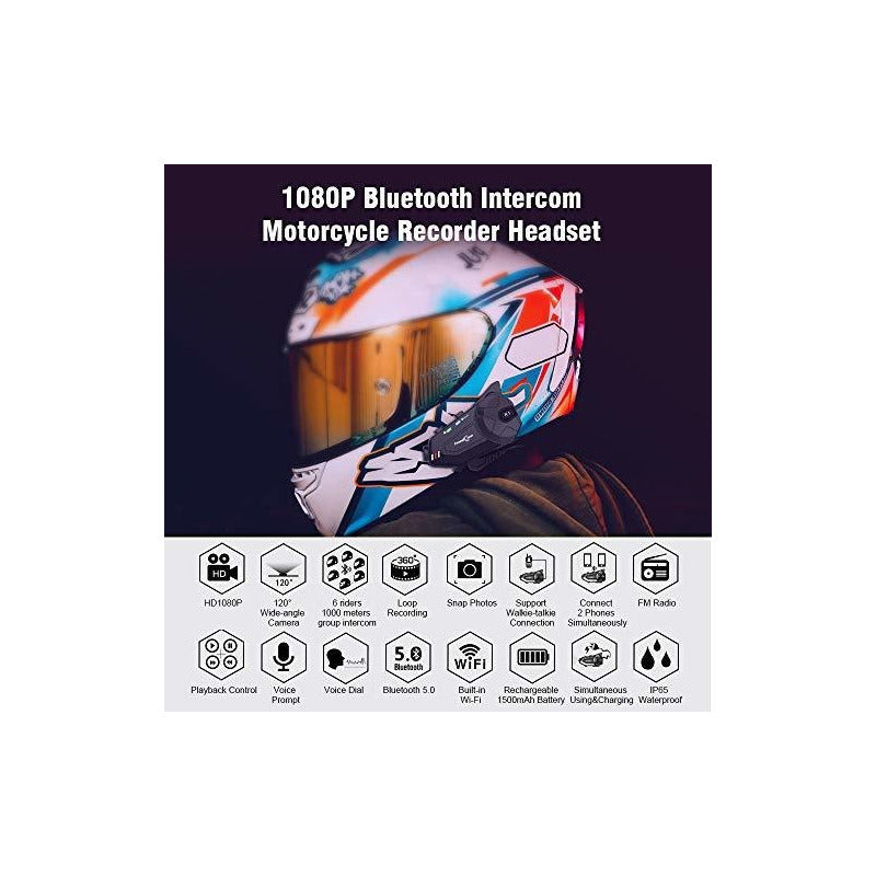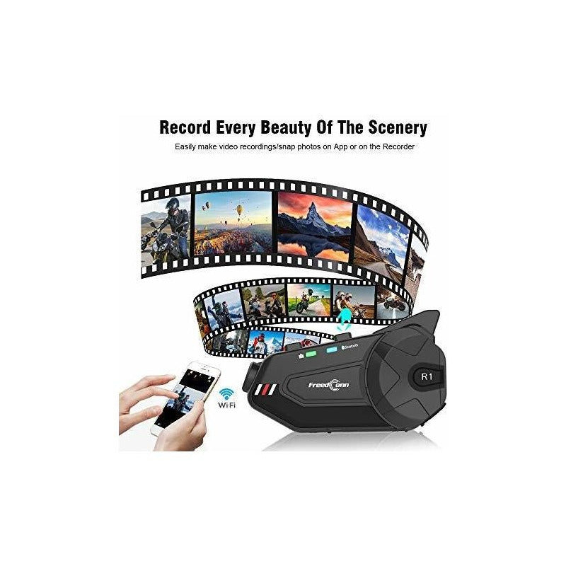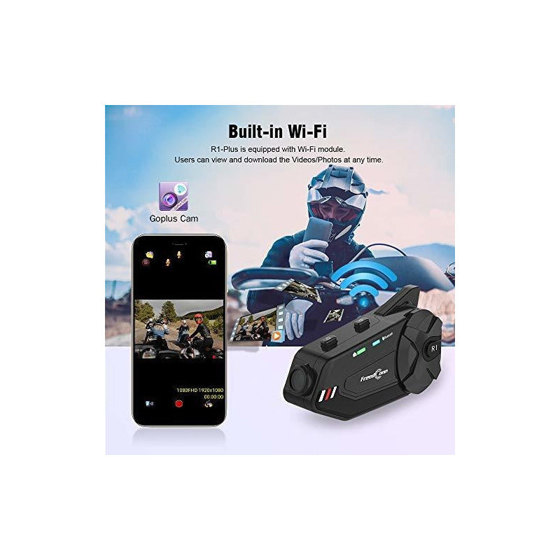 Intercomunicador para casco de motocicleta con cámara: cámara HD 1080P integrada con lente gran angular de 120 grados, los auriculares para casco de motocicleta grabarán y capturarán momentos emocionantes claramente, y la función WI-FI te permite ver videos e imágenes grabadas por intercomunicador de motocicleta con tu teléfono (por favor, descarga GoPlus Cam/Roadcam en la tienda de aplicaciones primero) Casco de motocicleta Bluetooth de 6 vías de 3,280.8 ft: compatible con intercomunicador de grupo de 6 ciclistas con distancia máxima de hasta 3,280.8 ft, y la tecnología Bluetooth 5.0 garantiza una comunicación más estable del casco, intercomunicador inalámbrico y conectividad Bluetooth, que puede conectar 2 dispositivos Bluetooth simultáneamente, por lo que no perderás ninguna llamada mientras escuchas música. Auriculares Bluetooth para motocicleta con reducción de ruido CVC: los auriculares Bluetooth FreedConn R1 PLUS para motocicleta proporcionan un sonido nítido y música estéreo de alta calidad desde tu dispositivo Bluetooth a través de la avanzada tecnología de reducción de ruido inteligente CVC. Te permite escuchar música, noticias, información de tráfico o indicaciones de voz de navegación GPS mientras contestas el teléfono o walkie-talkie. La radio FM hace que tu conducción sea más interesante Cámara de motocicleta de larga duración de la batería: la batería de litio de 1500 mAh de alto rendimiento de batería ultra larga, después de 2 horas de carga completa, este dispositivo de comunicación Bluetooth soporta 12 días de tiempo en espera, 30 horas de conversación telefónica, 4.5 horas de grabación de video o 48 horas de tiempo de música, y se puede utilizar mientras se carga, no afectará a tu conducción. Clasificación IP65 impermeable bajo la norma IEC 60529. Botón giratorio de operación con una tecla: control de un solo toque para responder y rechazar llamadas entrantes, llamadas de voz activando Siri/Bixby y etc., ajuste de volumen, reproducción/pausa música, radio FM y audio de navegación GPS. Auriculares de alta calidad y altavoz HiFi con sonido estéreo completo viene con el paquete.