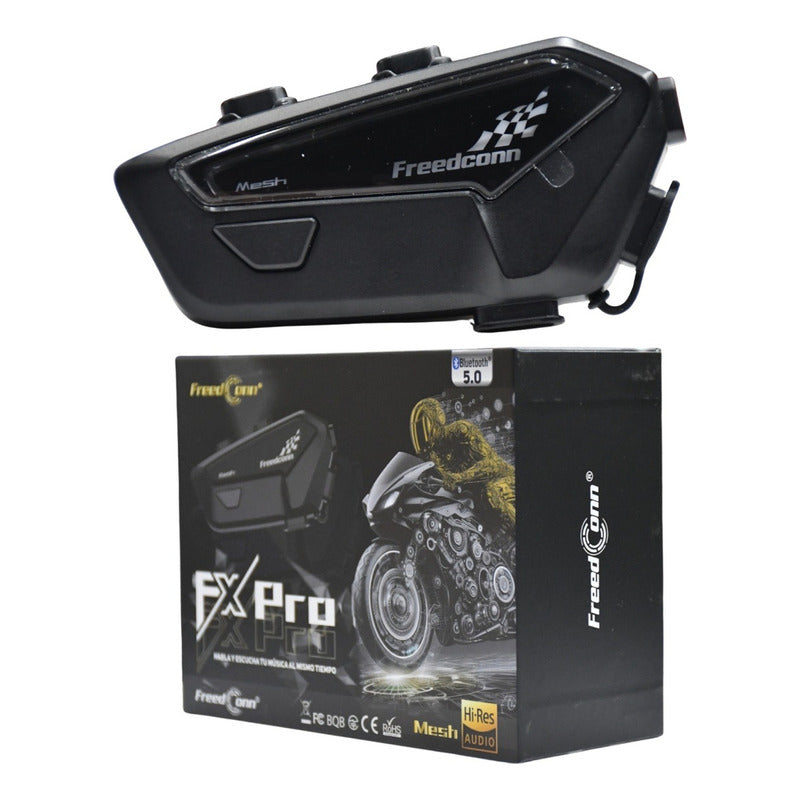 El intercomunicador FX Pro MESH es el último producto de FreedConn que revolucionará su experiencia mientras conduce una motocicleta. Gracias a el podrás comunicarte libremente con otros usuarios, así como vincularlo con tu teléfono, navegador o reproductor de música mediante tecnología Bluetooth. Esto significa que podrás escuchar música o instrucciones de navegación de una forma muy cómoda. El dispositivo FX Pro V2 EU MESH también tiene muchas otras funciones, como la respuesta automática al teléfono, la posibilidad de devolver la llamada al último número o la marcación por voz (según el modelo de teléfono). El alcance del intercomunicador en condiciones ideales es de 1200 metros, durante un uso normal alcanza los 450-500 metros. La batería de 1100 mAh te permite hablar hasta 20 horas a través del intercomunicador y hasta 250 horas en modo de espera. El tiempo de carga es de sólo 2 horas, lo que significa que el dispositivo estará listo rápidamente para el siguiente uso. Comunicación MESH moderna. Escuchar música desde su teléfono en segundo plano durante una llamada de intercomunicador. Versión en polaco: anuncios en polaco. Nuevos auriculares híbridos – 2 micrófonos incluidos – para cascos integrales e integrales. La última versión del módulo Bluetooth 5.0: conexión más estable. Calidad de sonido de alta resolución (HI-RES). Anuncios de navegación durante una llamada de intercomunicación. Comandos de voz impulsados por inteligencia artificial AI. Posibilidad de emparejar un total de 6 dispositivos. Modo MESH (comunicación gratuita sin realizar pedidos). El último módulo Bluetooth 5.0 + DSP + EDR. Posibilidad de escuchar música (radio FM, Spotify, Tidal, etc.) y hablar por intercomunicador al mismo tiempo. Posibilidad de escuchar mensajes de navegación y escuchar música durante una conversación por intercomunicador. Posibilidad de conectar navegador/teléfono/reproductor de música mediante Bluetooth. Contestación automática de llamadas entrantes. Radio FM incorporada. Sistema de reducción de ruido EDR, DSP, VOX. Potente batería incorporada de 1100 mAh: hasta 20 horas de tiempo de conversación, hasta 250 horas de tiempo de espera. Construcción impermeable IP67. Pequeñas dimensiones: apariencia estética en el casco. Sonido HI-RES cristalino: calidad de sonido cristalino (2 micrófonos incluidos tanto para cascos integrales como para cascos integrales). Comandos de voz impulsados por inteligencia artificial AI. Señalización LED.