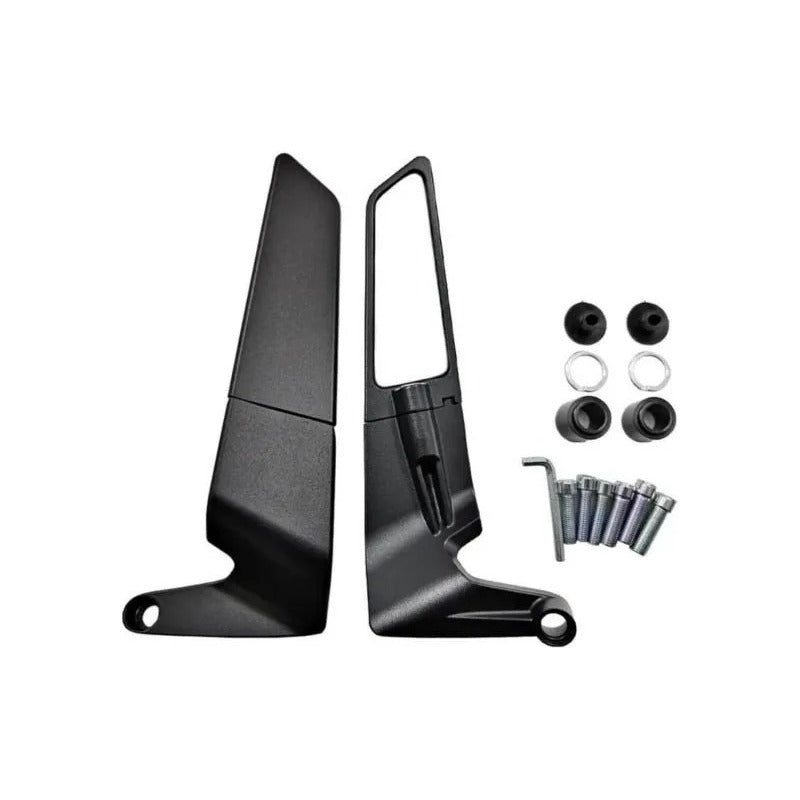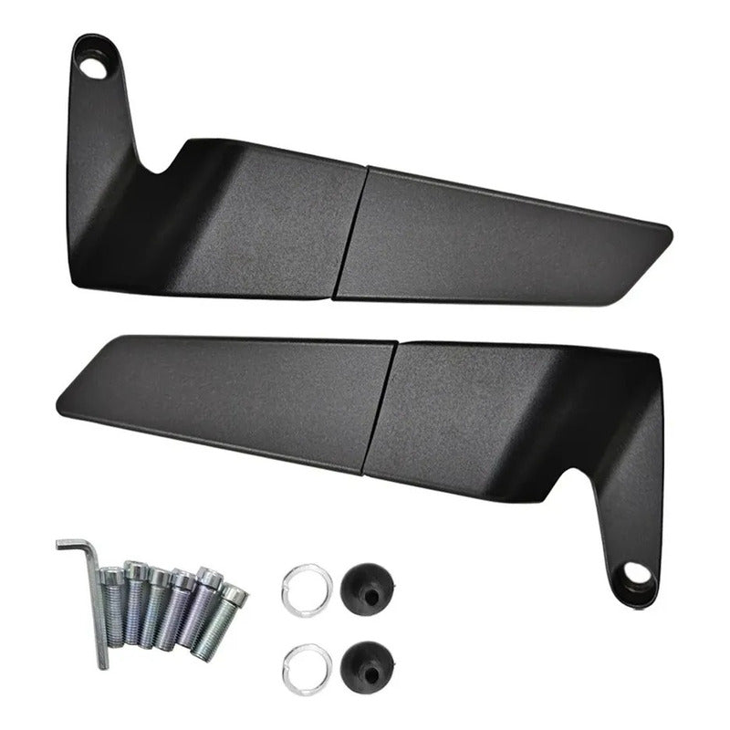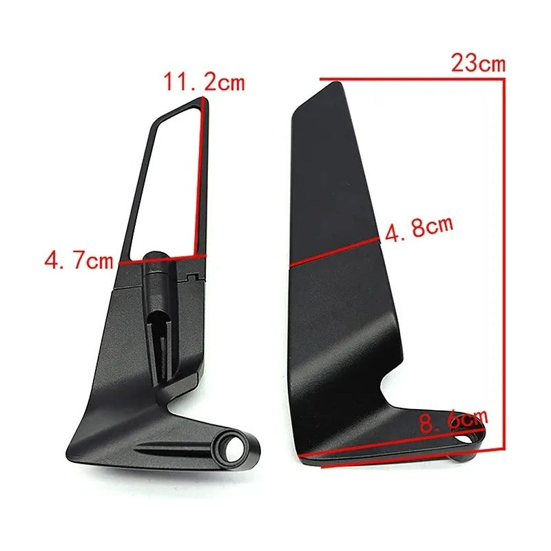 Material: Aluminio Color: negro Ajustable Tipo de espejo convencional Facil de instalar Precio por par Se ajusta a la mayoría de las motos Naked Espejos Alerón para motos Naked universales adaptables a cualquier moto que tenga sus espejos en sistema de 1 tornillo Incluye tornillería de 8 y 10 mm